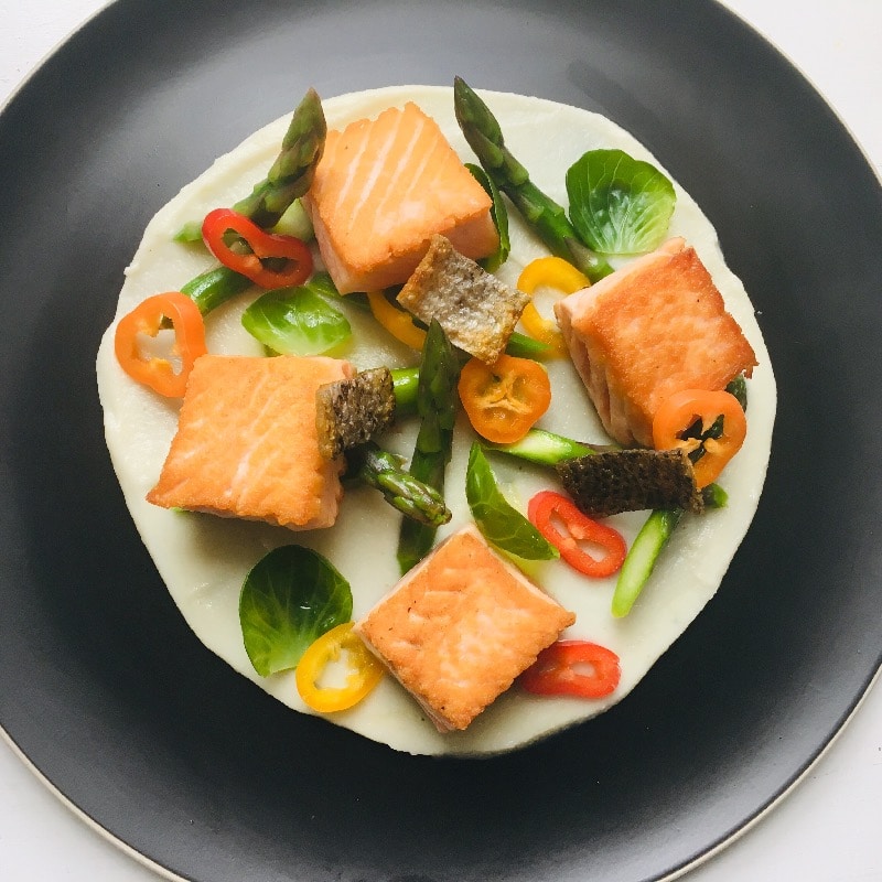 Branzino with eggplant purée, cauliflower and roasted radish