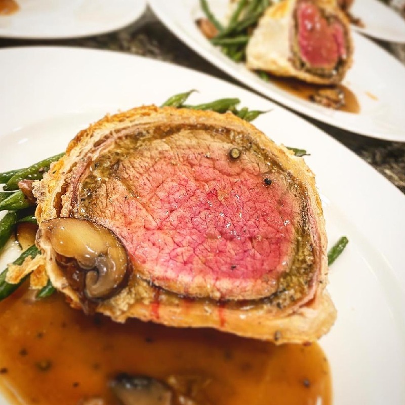 By Kurt - Seared Lamb chop, sundried tomato risotto, bouguetiere vegetables with butternut squash bechamel, brie cheese and duxelle en croute and crostin bruschetta i